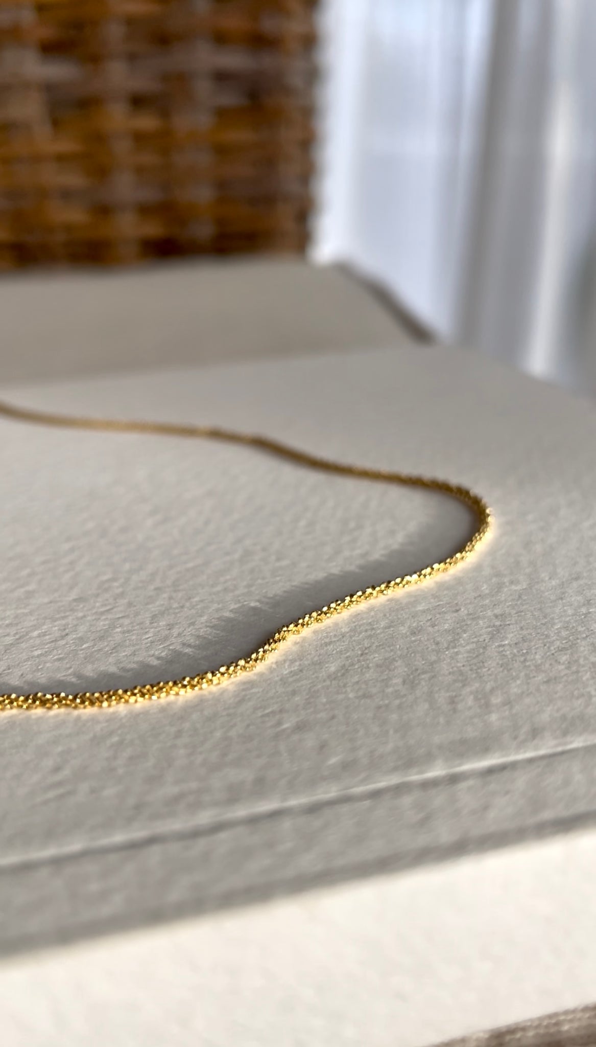 Sa maille tout en délicates ondulations, capte la lumière à chaque mouvement, créant de minuscules éclats dorés comme une traînée d’étoiles autour du cou.